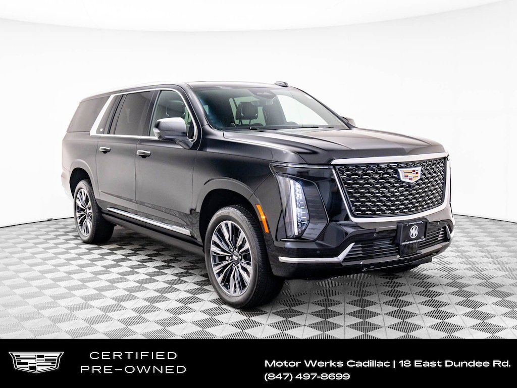 Rare Fully Loaded Low Mileage Clean One-Owner Cadillac Certified Black Raven 2025 Cadillac Escalade ESV Premium 4WD With Wireless Apple CarPlay, Wireless Android Auto, Remote Engine Start System, Super Cruise, Ultraview Panoramic Moonroof, Dynamic Drive Mode System, Magnetic Ride Control Suspension, Adaptive Air Ride Suspension, Suspension Lift & Lowering System, Heads Up Display, Rear Vision Mirror Camera, Rear Vision Camera Washer, Adaptive Cruise Control, Automatic Emergency Braking System, Automatic Parking Assist, Rear Cross Traffic Alert System, Blind Spot Monitor System, Emergency Forward Braking System, Lane Departure Warning System, Lane Keep Assist System, Front Pedestrian Braking System, Traffic Sign Recognition, Safety Alert Seat, Teen Driver System, Front & Rear Park Assist System, Heated 2nd Row Seats, Heated & Cooled Front Seats, Heated Leather Steering Wheel, Premium Leather Seating w/Contrast Stitching, Navigation System, WiFi Hotspot Capable, Wireless Phone Charging Pad, AKG Studio 19-Speaker Performance Sound System, SiriusXM Radio, Rear Backup Camera, 360 Camera System, Front & Rear Parking Sensors, Fully Automatic LED Headlights w/Signature LED Daytime Running Lights, LED Tail Lights w/Dynamic Turn Signals, LED Interior Ambient Lighting, 2nd Row Captains Chairs, 3rd Row Seating, Power Running Boards w/LED Perimeter Lighting, Hands Free Rear Power Liftgate, 22 Aluminum Alloy Wheels, Virtual Cockpit w/Dynamic Display, Bluetooth Hands Free Phone System w/Wireless Streaming Audio, Push To Start Ignition, 55 Diagonal Curved Display Screen, 4WD, 2-Speed Active Transfer Case, Electronic Limited-Slip Differential, Front Dual Zone A/C, Heated Door Mirrors, Hitch Guidance w/Hitch View, Illuminated Entry, Integrated Trailer Brake Controller, Memory Seat, Outside Temperature Display, Power Door Mirrors, Preferred Equipment Group 1SB, Rain Sensing Wipers, Remote Keyless Entry, Smart Trailer Integration Indicator, Soft Closing Front & Rear Doors, Theft-Deterrent Alarm System, Touring Package, Trailering Assist Guidelines.